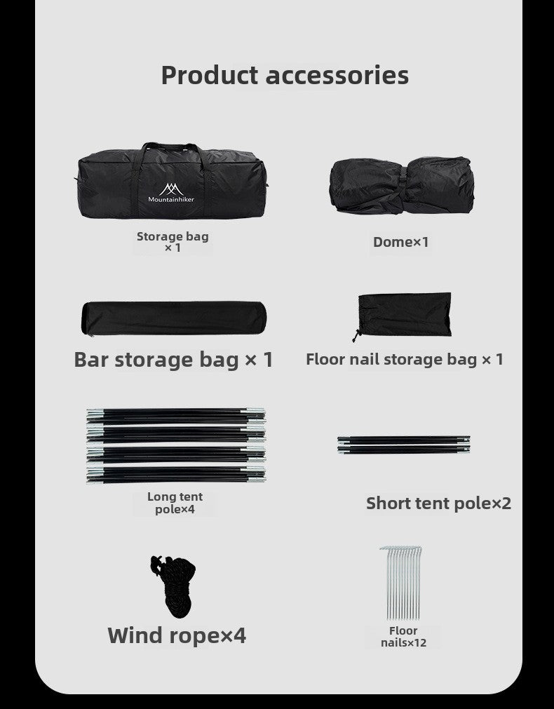 Note: For best results, always secure your tent with floor nails and wind ropes. Avoid use in extreme weather conditions (storms, heavy snow, etc.).